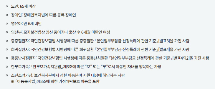 • 세대원 특성 기준 : 수급자 본인 or 주민등록표상 세대원이 다음 어느 하나에 해당