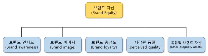 브랜드 자산은 브랜드 인지도, 브랜드 이미지, 브랜드 충성도, 지각된 품질, 독점적인 자산(특허, 등록상표 등)으로 나눌 수 있습니다.