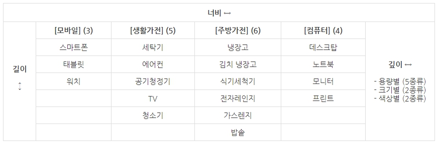 동서울전자(주)의 모바일 제품계열에는 스마트폰, 태블릿, 워치의 3개 종류가 있으므로 모바일 계열의 길이는 3이 됩니다. 생활가전 계열에는 5개 종류가 있으므로 생활가전 계열의 길이는 5가 됩니다.