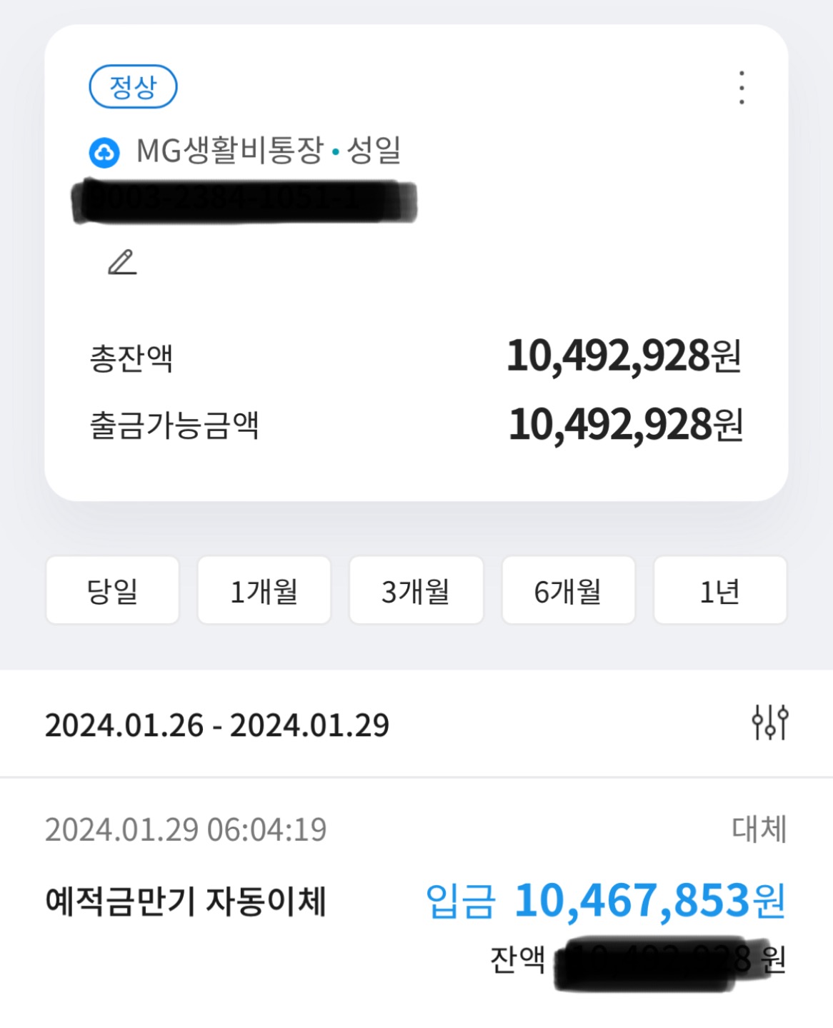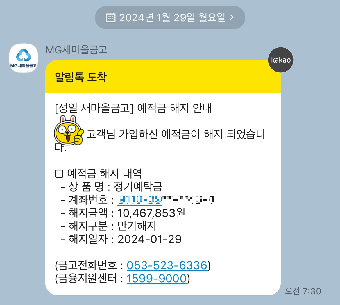 작년 이맘때 새마을금고에 1천만원 예금 든게 만기가 되었다고 아침부터 알림톡이 왔다. 이자랑 얼마쯤 나왔을까? 확인하고 다시 예금으로 또 묶어야지 싶어 얼른 확인해 봤다.