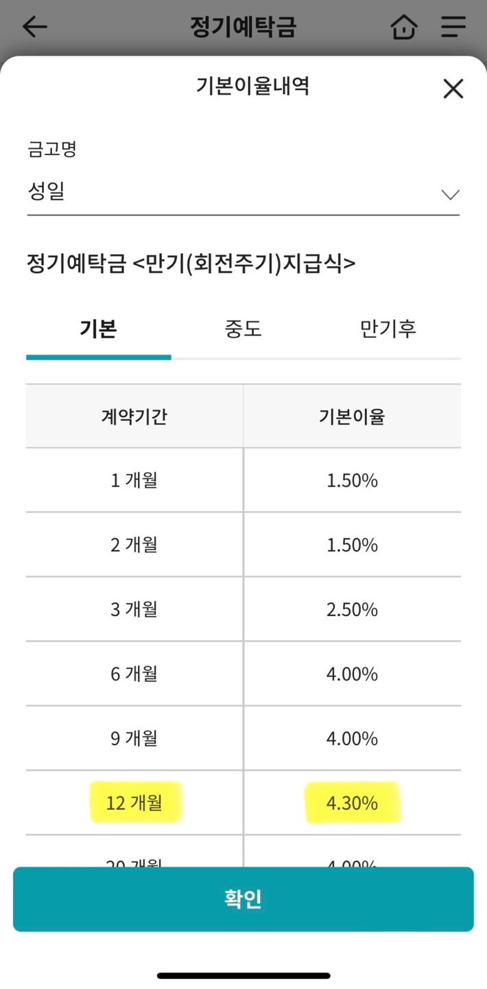 12개월 1년 예금금리가 4.3%로 가장 높고, 60개월까지 있는데 12개월 넘어가면 모두 4%로 1년 이율보다 낮다. 보통은 1년으로 많이 가입하니 1년 이율이 가장 높은 듯하다.