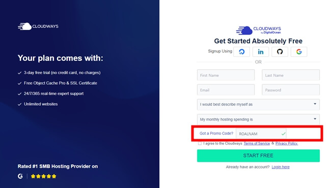 요즘 한국에서 클라우드 웨이즈를 많이 사용해서 가입이 더욱 까다로워졌다는 블로그 글을 봤는데 결국 나는 할인코드를 지우고 월간 호스팅 비용 선택을 $0 ~ $50 이 아닌 그다음란에 $50 ~ $250으로 선택하니 가입이 되었다.