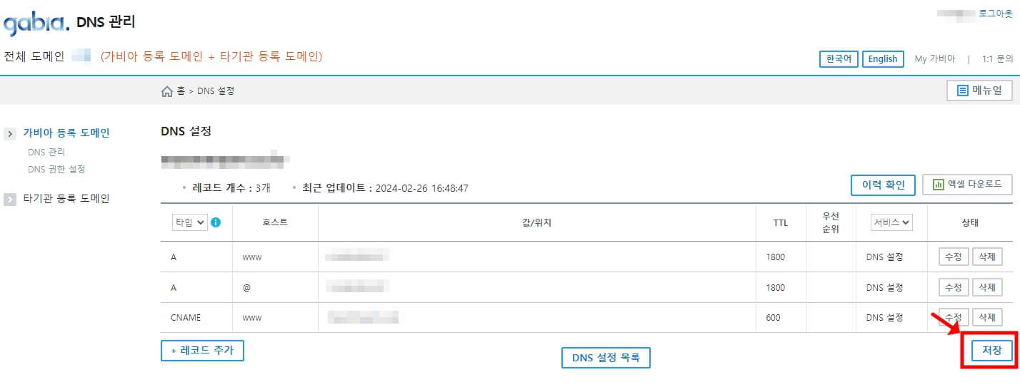 이렇게까지 하는데 이미 하루가 다 가버렸다. SSL 설치도 바로 안돼서 얼마나 헤맸는지.. 가비아에서 DNS 설정할 때 레코드 추가를 누르고 우측 하단에 "저장"을 눌러야 연결이 되는데 계속 추가 단계까지만 하고선 SSL 설치를 했으니 됐을 리 만무..